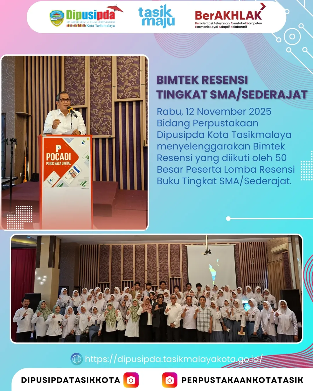 Rabu, 12 November 2025 Bidang Perpustakaan Dipusipda Kota Tasikmalaya menyelenggarakan Bimtek Resensi Tingkat SMA/sederajat. Kegiatan ini ......